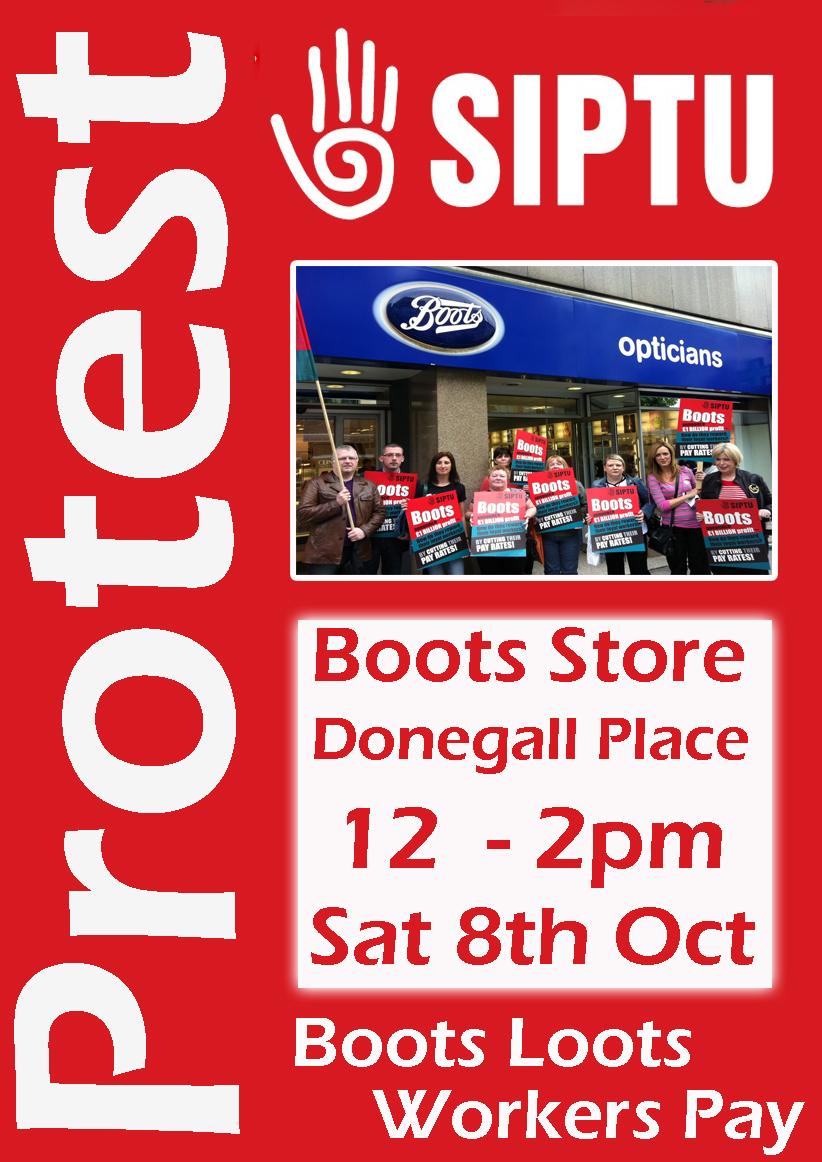 Working alongside their union SIPTU, they are taking a stand and campaigning to reverse this ruthless decision by Boots. We ask you the public to assist us, by supporting the days of action, signing our online petition at www.petitiononline.com/bootloot/petition.html and crucially registering your complaint with senior management in Boots.