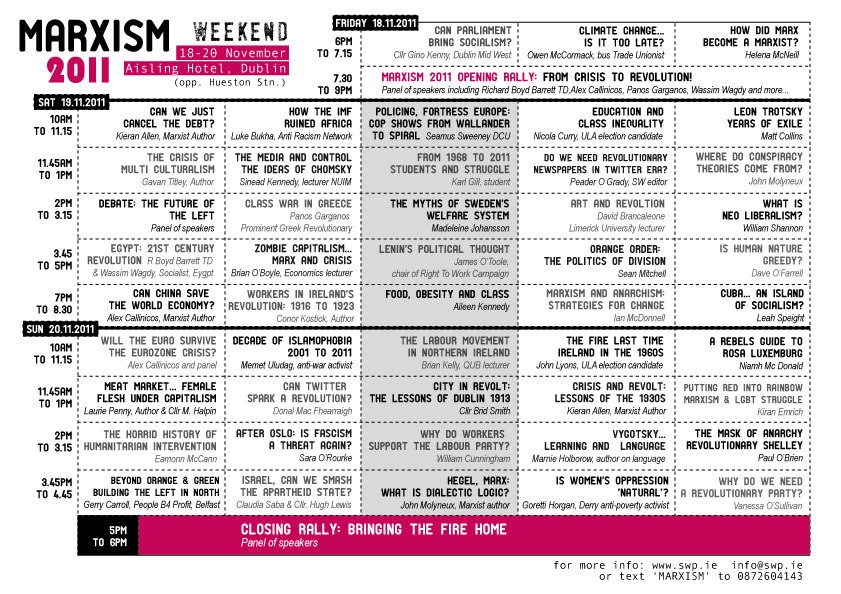 withAlex Callincos (author Bonfire of Illusions)Gavan Titley    (author Crisis of Multiculturalism)Kieran Allen    (author Marx and the Alternative to Capitalism)Laurie Penny    (guardian columnist)Wassim Wagdy     (Egyptian Activist)Eamonn McCann    (author and journalist)Richard Boyd Barrett TD and many more....