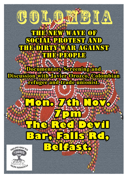 The Red Devil Bar, Falls Rd., Belfast Colombia has a reputation for the human rights abuses in the middle of the ongoing social and armed conflict. Little is known about the resistance movement and popular resistance to war-mongering and to the economic and political model structurally linked to war. At the heart of this popular struggle lies the key to understand the current conflict and the persistence of human rights violations in Colombia. This year has witnessed a dramatic increase in popular struggles all over the country: students, oil workers, peasants, poor communities, indigenous groups. As a result, the dirty war waged by the system has got even dirtier. Massacres are on the raise and so are military actions all over the country. In February 2010 a human rights delegation from Asturias visited Colombia for the sixth time to record the humanitarian crisis in the country. They were harassed by the army sand they were denied access to interview political prisoners in the infamous prison of Valledupar, La Tramacúa, where a number of political prisoners have died this year out of ill-treatment, torture and deprivation. But the managed to cover the situation in the departments of Antioquia, Caquetá, Cauca, Cesar, Putumayo, Bolívar y Cundinamarca. In all of these places, they corroborated the dramatic humanitarian situation and the systematic abuse of the military and their death squads against the population.But most importantly, they give a voice to those who day to day struggle for a just Colombia, for a new country which belongs equally to all of its offsprings. The results of the mission and many interviews were recorded in a docummentary (subtitled to English for the first time). This will be screened to open up a debate on the situation in Colombia. The coordinator of this commission, Javier Orozco, a person with a deep knowledge of the Colombian conflict and with an international reputation for his work for human rights, will present the documentary and will be available for questions and answers from the public. Javier Orozco Peñaranda (50), is an ex member of the national executive of Colombia's main trade union (CUT), ex member of the national council of peasant and indigenous organisations of Colombia, he's been a refugee in Spains since 2001 (after a death squad put a price on his head) and now he's the coordinator of the programme for temporary asylum for Colombians victims of violence in Asturias.