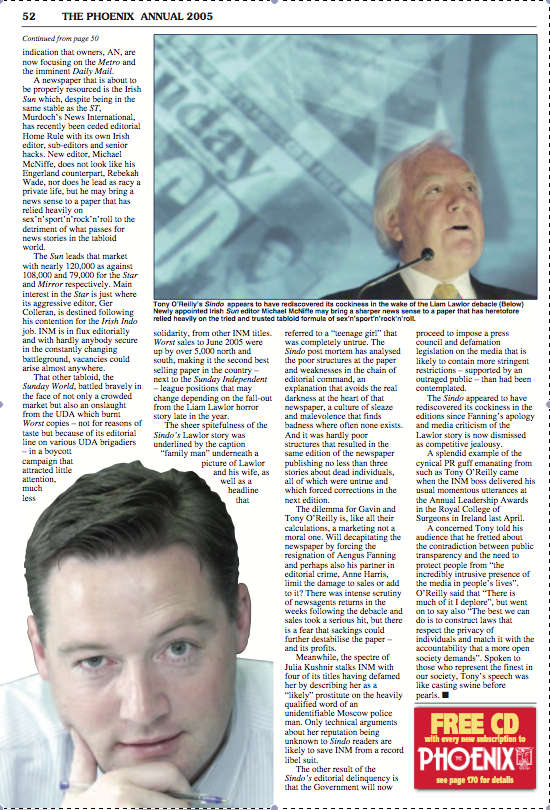 CLICK TO READ - Sunday Independent Oct 23, 2005 - white space is where article was - see 'family man' photo caption that includes Lawlor's wife and obligatory sexist addition, Glenda Gilsen