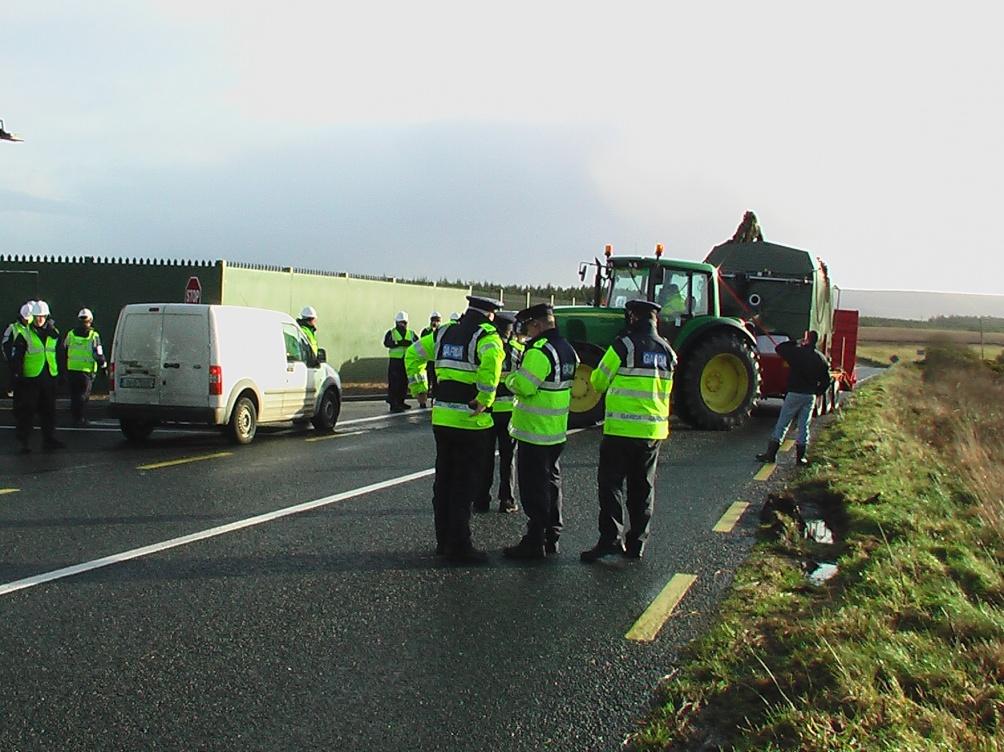 In the meantime, protesters arrived to slow work down and were met with six garda vehicles and a dozen or more Gardai along with just as many IRMS security. A tractor was prevented from entering the compound with equipment despite gardai pushing and shoving protesters around the road. Once the campaigners asked the Gardai to fullfil their duty and arrest them for blocking Shell vehicles the Gardai stepped back. It is obvious that the state’s police force here in Mayo prefer to employ violence against protesters where possible. Civil disobedience in numbers made them think again.