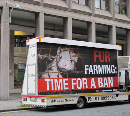 ARAN, Respect for Animals and the Animal, Anima and Fur Free Alliance (FFA) have released the findings of a new 2011 undercover investigation into Ireland's shameful fur factory farms, showing that yet again, animal suffering, is still very much business as usual. The recently obtained footage from an Irish mink farm, reveals images of animal suffering, including painful injuries on mink's tails; cramped, aged and filthy cages riddled with the animal faeces, and more shockingly the images of stressed, traumatised and balding animals; which spotlights the stereotypical behavior associated with intensive farming. Ireland's government are seeking submissions into Irish fur farms which close on December 31. Getting straight to work, a giant mobile billboard shadowed the Department of Agriculture in Dublin with a message 'FUR FARMING: TIME FOR A BAN,' before taking to the streets to garner public. support.