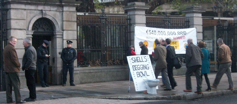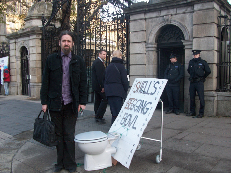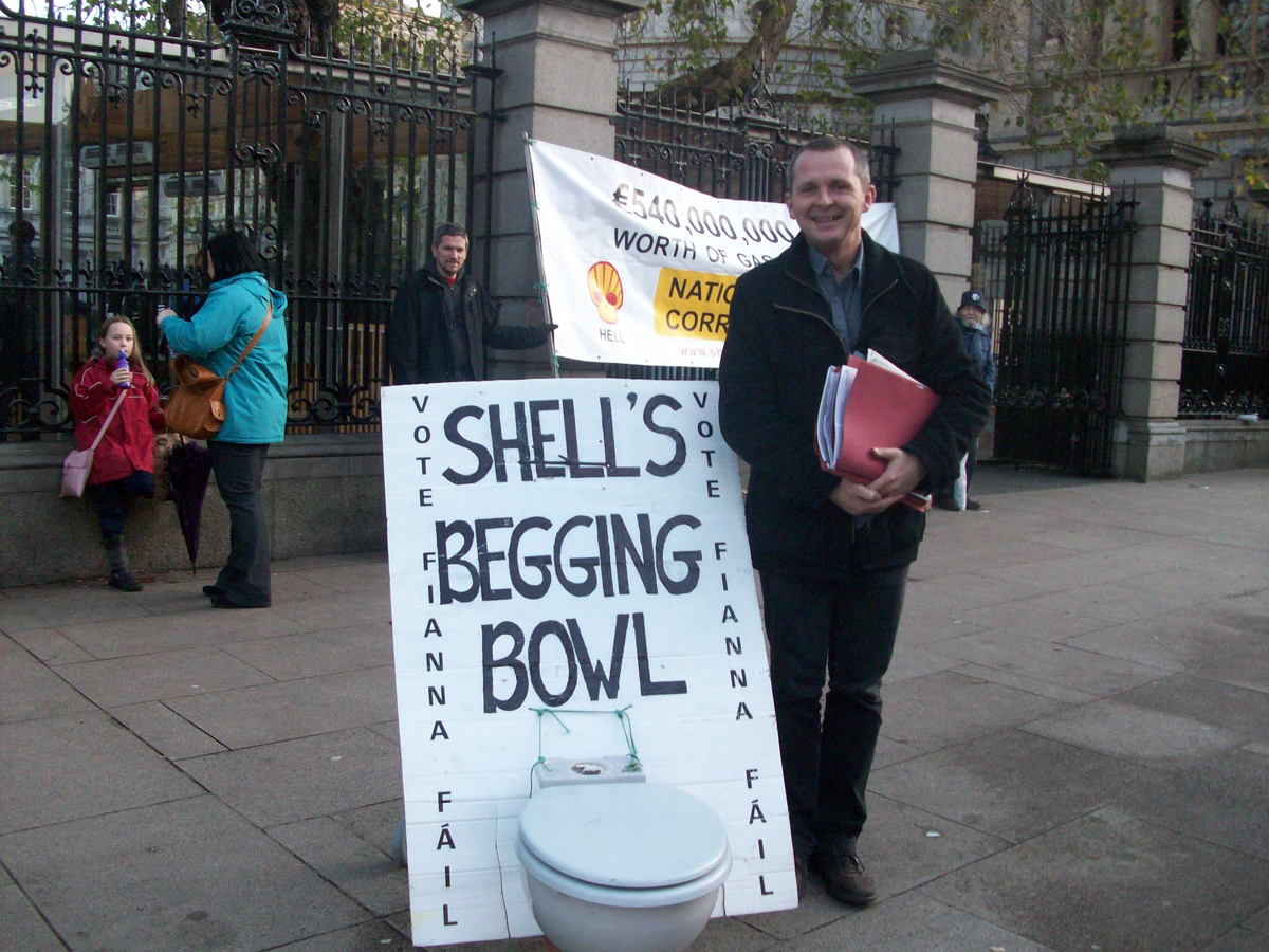 The Begging Bowl may not be a thing of beauty but it is fair comment on its subject. Its place within Shell to Sea is one element of the campaign as a whole - it's carted about and set up by some people within Shell to Sea and, because we are non-hierarchical and not likely to play the 'politics of condemnation' or be prescriptive about peoples' actions these people are welcome to continue to do what they do as long as it remains effective - and it is effective!
