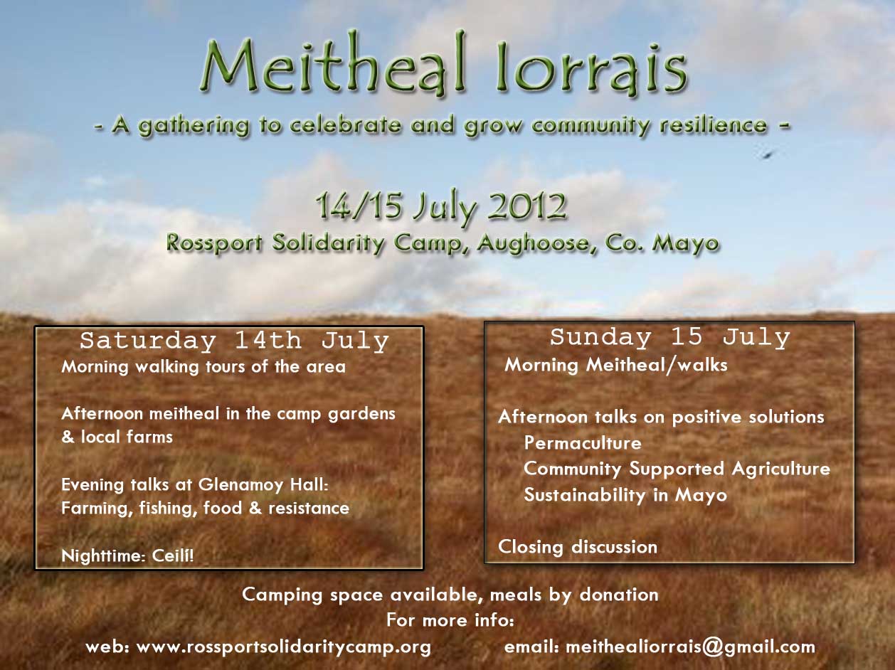 Meitheal Iorrais - a gathering to celebrate and grow community resilience - will be taking place at the Rossport Solidarity Camp in Aughoose, Erris Co. Mayo on the 14th/15th July, 2012
