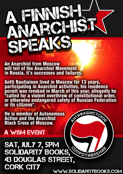 This Saturday July 7th, at 5pm Solidarity Books will host the Cork segment of a European speaking tour with Antti Rautiainen, a Finnish Anarchist from Moscow who will talk about the anarchist movement in Russia, its successes and failures.