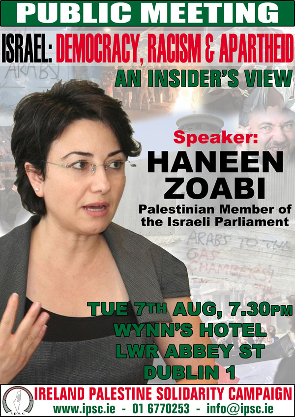 The Ireland Palestine Solidarity Campaign (IPSC) is proud to invite you to a public talk by Haneen Zoabi MK, a Palestinian member of the Israeli Parliament on Tuesday 7th August in Wynn’s Hotel, Lower Abbey Street, Dublin 1 at 7.30pm.
