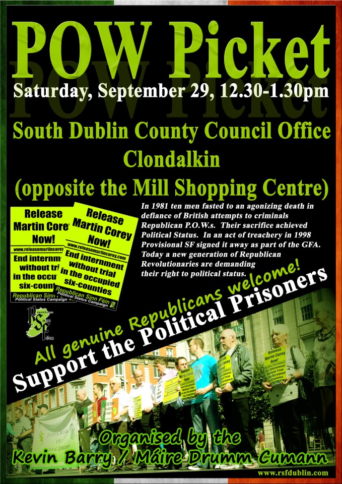 The Clondalkin-based Kevin Barry / Maire Drumm Cumann of Republican Sinn Féin will hold a picket in support of Irish Republican prisoners on Saturday 29th September 2012 in front of the South Dublin County Council Offices in Clondalkin Village (opposite the Mill Shopping Centre) from 12.30pm to 1.30pm.
