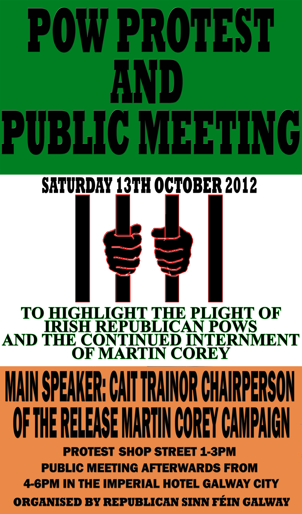 Protest and public meeting to highlight the continuing conditions Of Republican POWs in Maghaberry prison and the continued internment without trial of Martin Corey on Saturday 13th October 2012. The protest will take place on Shop Street between 1-3pm with the meeting afterwards in the Imperial Hotel in Eyre Square between 4-6pm. The main speaker for the meeting will be Cait Trainor from Armagh.