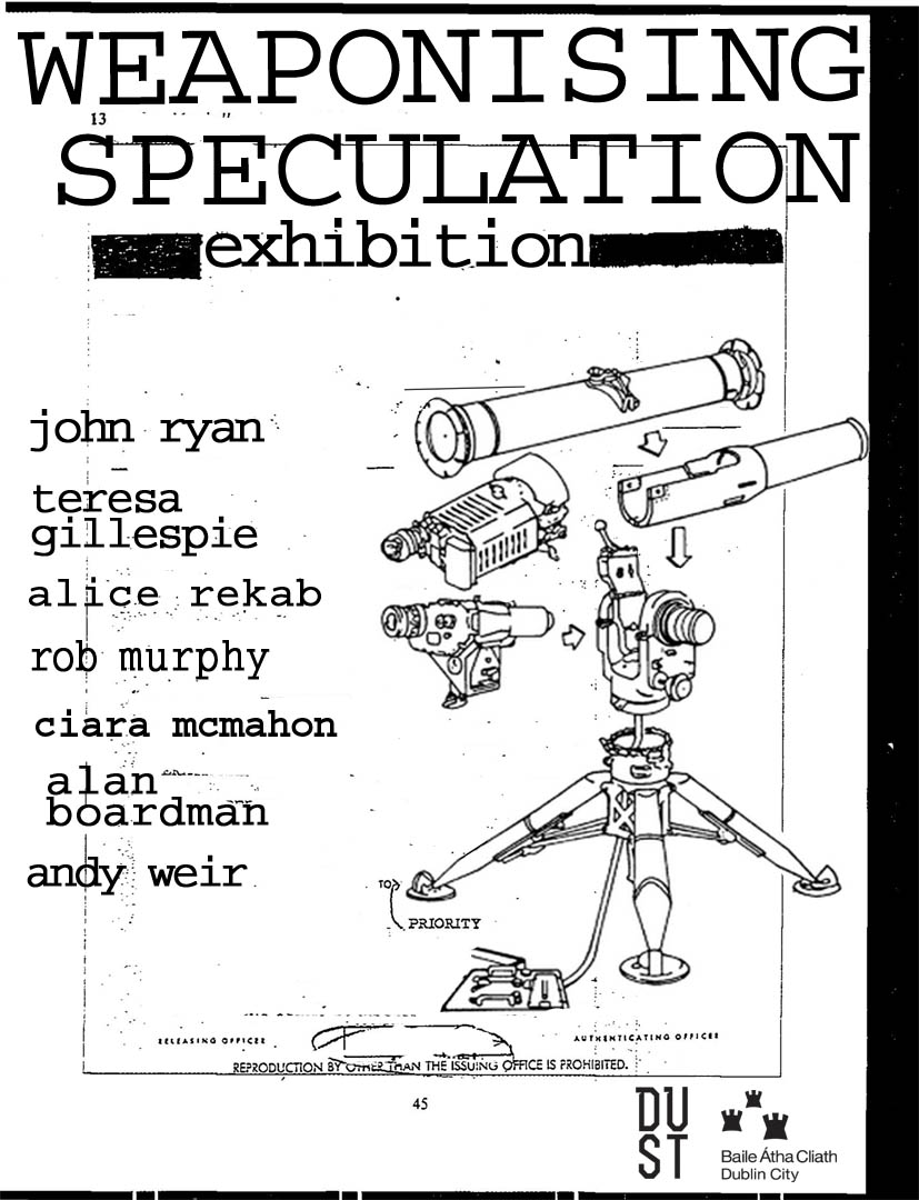 The Weaponising Speculation exhibition is an accompaniment to the conference of the same name organized by D.U.S.T (Dublin Unit for Speculative Thought), an art/theory collective recently founded by Michael O'Rourke, Paul Ennis and Fintan Neylan.