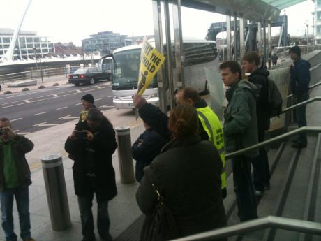 Demonstrators are proceeding to the National Convention Centre to picket out the IBEC organised meeting of Chief Executives from across Europe being addressed by Head of the EU Commission, Jose Manuel Barrosso, the Taoiseach and Junior Minister for Europe Lucinda Creighton.