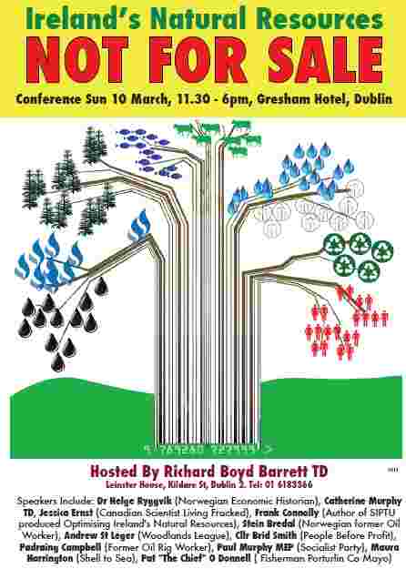 The Irish government is giving away our natural resources. Oil and Gas exploration licences have been handed out to big multi nationals under terms that mean the Irish people do not gain jobs, a revenue stream or security of supply. Practices with serious environmental consequences, such as fracking, are not ruled out under law whilst in France they were. The harvesting rights to our forests are about to be sold to the highest bidder. This threatens access rights of the Irish people to walk in our forests and endangers the sustainability of our woodlands as they will be exploited for quick sale of timber. Our water is about to be privatised. The first move has been to transfer the administration of the water services to a new semi state Irish Water and next year water charges will be introduced. When water was privatised in the north of England, the area experienced its first ever water shortages! Fishing in Ireland has been destroyed by huge multi-national trawlers, aided and abetted by EU quota regulations, plundering our waters. What we need is a sustainable fisheries policy that protects the livelihoods of small fishermen and allows local fishing industry to flourish creating jobs and protecting a valuable natural resource. The mismanagement and privatisation of our natural resources has a detrimental impact on the environment, jobs and our economy. Decisions are regularly made with regards to our natural resources without any public consultations, which are required under EU law. There is no serious plan for a programme of major public investment to develop renewable energies. Ireland is in an unprecedented economic crisis. Our natural resources have enormous potential for jobs and economic growth as would a national project to develop renewable energies. We must act now to change the policy of facilitating multi nationals in their pursuit of projects which is undermining our economy and the environment. Come along to our conference on Sun 10 March 11.30 – 18.00 in The Gresham Hotel, O Connell Street, Dublin 1 Note: Jessica Ernst will be speaking on Fracking at 1pm. For the Conference Timetable see the PDF below