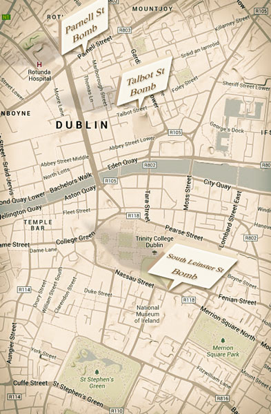 The picture shows the rough locations of the three bombs that went of in Dublin on the 17th May 1974.
