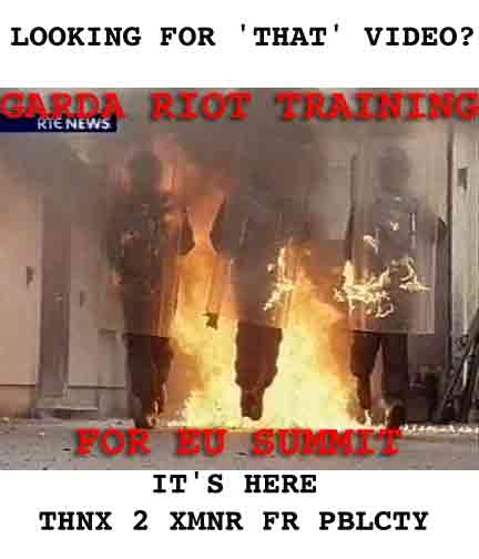 First up here's the Video According to Juno McEnroe of the Irish Examiner ( Paper edition only for some strange reason) on today's front page - I'm summarising: "The video has been circulated via the internet to hundreds of thousands of lefties." "Gardai have expressed concern about it. Their hands are tied in relation to the threats contained in the video" The footage makes chilling references to the need to destroy the EU while zooming in on Bertie and Brian ~Cowen. Examiner identifies the narrator as 'english.' (Oh those nasty Brits) Garda spokesperson sez they are powerless to stop the video being circulated. gardai will not alter security arrangements for bertie because of the video. It of course as per usual makes reference to the Reclaim the Streets Riots - Riots which unless described as 'police riots' never actually took place." Helpfully the article mentions Indymedia very Frequently and quotes in a garbled fashion an unnamed 'spokesperson'. (Thanks for the publicity Examiner - You know - or you will soon enough - you should have just said 'a website') Less than helpfully it gives the impression that Indymedia is a natural starting point for police attention: "Gardai are setting up ad-hoc centres to detain protesters on May 1st. Indymedia is establishing a 'world media centre' off Dublin's Mountjoy square". The journalist is either a bought and paid for character or is stupid as nowhere in the article does he/she mention the videomakers rationale for making the piece and the fact that the only references to riots in the video are snapshots of other previous scaremongering press headlines. From this to the headline - Video Urges Dublin Riots to Destroy EU' - is some jump. The video categorically does not 'urge riots' - it promotes a series of protests including a critical mass bike ride, a pro-immigrant protest and a Reclaim the Streets protest while taking a critical view of the anti-democratic propaganda being pumped out by Irish newspapers and television. "Propaganda by Maydayer Wednesday, Mar 31 2004, 9:08pm "Sadly this video is just as sensationalistic" YES that was the point - thus the title - Mayday propaganda. It was a piss take a bit of fun, propaganda can work both ways. It was meant to show how silly (and frightening) the whole thing is. I am sure most Indymedia viewers are smart enough to see what’s going on. Using the media to create fear as justification for violence, that’s what I said in the video. As for attracting "extreme elements" of whatever the cops are calling peace protesters or environmental activists, I think the corporate media has already done a good job of that. The only thing this video advertises is peaceful protests like critical mass and RTS. Note * not one stone let alone one petrol bomb has ever been thrown at a (anti-War Globalisation) protest in Ireland - It is not the Irish protesters who are arming themselves to the teeth and training for violence is it? Lets look at the facts and look behind the propaganda lie machine. Any violence on Mayday if there is any will likely come from the State against the protesters, the Government is running scared - every day now they make another announcement escalating and militarising the situation. As for the video tongue in cheek ;) stay tuned for many more..." So who in our wonderful society is going to stand up for the right of Indymedia to report on whatever happens? Not many it seems considering the number of individuals and organisations on the left who have stood up for the democratic right to protest the EU summit in the face of the unceasing and increasingly hysterical manufacture of a moral panic by the gardai in cahoots with trained security correspondents and with elements in the cabinet. The number of individuals and organisations on the left who have asked any questions about such scaremongering about protests is none btw unless you count the protesters themselves.