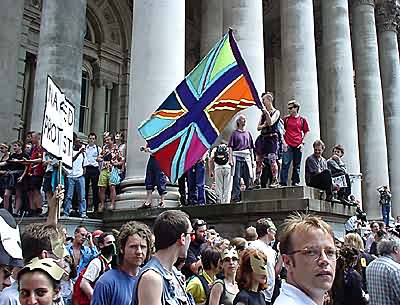But J18 wasn't an end to itself. It was always envisioned by the myriad groups who participated as a "rallying call". I don't think we wished to "rally" thousands of people to their local stock markets to "smash 'em up" because that would only have given the insurance and glazier sectors of the economy more work. We wished to return "protest" and "assembly" to "the street".