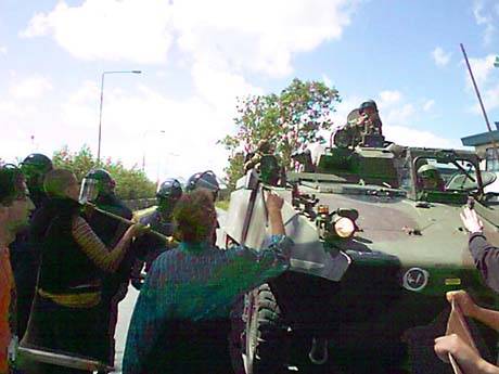 don't think i have ever laughed so much on a protest before, the tank blockade was hilarious. hatch pops open, soldier sticks his head out and says 'where are we?' as stickers, flags and subverted dollar bills festoon the mowag. there weren't any mainstream tv cameras there...but of course it still happened.