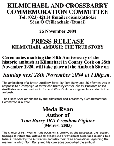 When asked how he responds to the specific criticism by Meda Ryan and Brian Murphy he says: “I recently gave a paper at Maynooth rebutting their statements about Kilmichael, but the question is so dependent on factual details that I don't have the space to really say much here.”