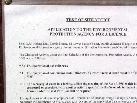 Here in Ballinaboy Shell propose, and it was accepted by the An Bord Plenala capitulation, to try this: what is essentially a very large field test, but to use it as a basis for building a gas refinery on it, and not alone that, but the flare tower, which would have to deal with releasing the pressure from the high pressure pipeline, they prose to build that on top of what they call stabilised peat.