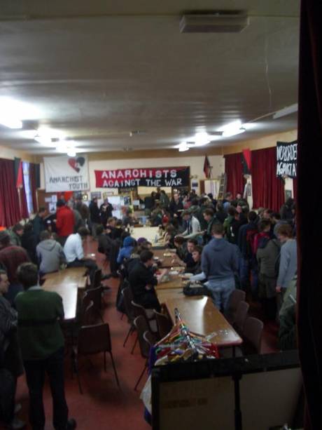 In terms of numbers I'd guess between 400 and 500 people were in at some point over the weekend but probably no more than 150 at any one time. The largest meeting was the republicanism and anarchism one, amazingly just under 50 managed to cram into the room (which only had room for 36 chairs). The people I asked mostly thought the level of discussion at the meetings was very good.