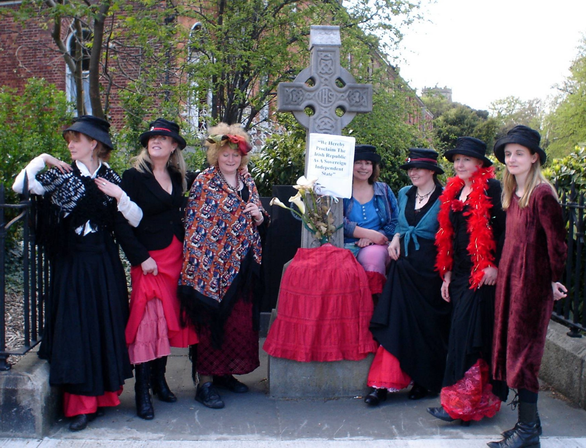 ... at the US embassy, it was back to the picnic for those who had the stomach for it. Passing Dev's cross on the way back we noticed its bare base! The Unmanageable ladieezz were shocked at such a public display of nudity - none of us wishing to gaze at Dev's bare plinth, glinting at us in the sunlight with a lascivious gleam. For the sake of modesty and public decency (Dev was big into those) a skirt was procured and wrapped around the offending member. Order restored, we posed happily. Then returned once again to our guests from Revolt video (who had found the balloons) ... and our sandwiches with the crusts cut off ... and our peppermint tea on the lawn...