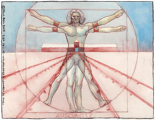 Jump To Comment: 1 2 3 4 5 6 7 8 9 10 11 12 13 14 15 16 17 18 19 20the illustration is by my pal, Steve Bell who sees some his stuff get into The Guardian, he saw this one first published in January 2005, its entitled "the meaning of Auschwitz"