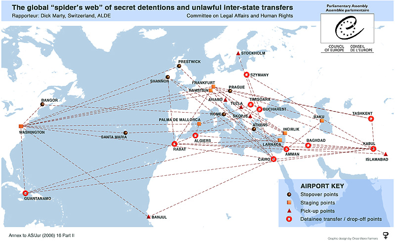 The Council of Europe has published a report, which states that the United States has "progressively woven a clandestine 'spider’s web' of disappearances, secret detentions and unlawful inter-state transfers – spun with the collaboration or tolerance of Council of Europe member states." Ireland is described (in section 11 of the report) as being part of this network, and "could be held responsible for collusion – active or passive (in the sense of having tolerated or having been negligent in fulfilling the duty to supervise) - involving secret detention and unlawful inter-state transfers of a non specified number of persons whose identity so far remains unknown... being [a] ‘stopover’ for flights involving the unlawful transfer of detainees."
