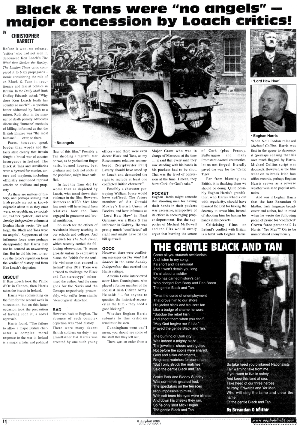 As these are matters of history, and perhaps sensing that Irish people are not as knowledgeable about it as they once were, ex-republican, ex-socialist, ex-Cork 'patriot', and now Sunday Independent columnist Eoghan Harris wrote: "By and large, the Black and Tans were no angels". Supporters of the infamous force were perhaps disappointed that Harris may not be counted an unwavering fan. But he did his best to rescue the force's reputation from the verdict of history and from Ken Loach's depiction.