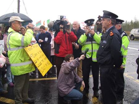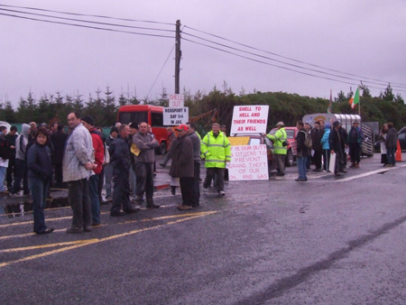 People power and peaceful resistance effectively completely defeated Shell’s first concerted effort to break the picket at the refinery site at Bellanaboy this morning. Early signs that a confrontation was imminent were apparent by the dawn arrival of seven carloads of extra security guards who sped into the compound. People on alert began to determinedly gather in front of the gates and banners and placards were distributed in readiness for the long prepared for initial showdown. At 7.40 a.m., 8 local Gardai and 2 special branch arrived, videoing and viewing the crowd of up to 150 protestors from across the road. Superintendent Joe Gannon approached and addressed the now shoulder-to-shoulder protestors comprising of women, children, men, old and young, who were effectively blocking the gate entrance. He announced the Gardai responsibilities to protecting the protestors from harm and enabling the legal right of people to access their place of work. He informed us that the workers would arrive at 8 a.m. at which time the Gardai intended to facilitate their entrance onto the site. He then gave us 10 minutes to discuss our course of action, in light of the information he had just imparted, and retreated to the line of waiting Gardai. He did not return to collect a verdict on this statement. Nobody moved as people stood resolute. His speech served only to reinforce the word amongst the picket that we were maintaining our right to peaceful protest. It strengthened our resolve and emphasised that peaceful resistance was our objective.