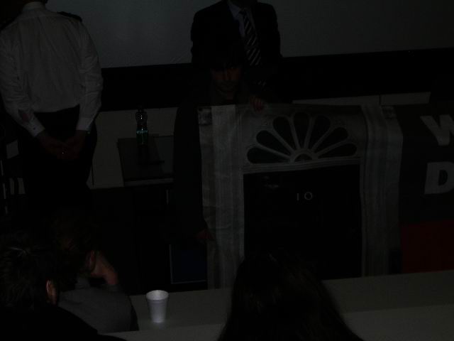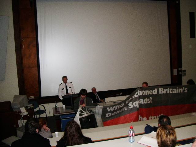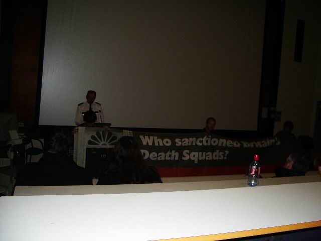 ![]() Hugh Orde delivered a public lecture last night in Queens University entitled ‘policing the past to police the future’. The event was organised by the institute of criminology and criminal justice at the university. Hugh Orde was joined on the panel by professor Kieran McEvoy (Institute Director) and Judge David Smyth QC (Chair of the Board of Directors), however a few minutes into his speech the Orde was confronted at the front of the lecture theatre by members of ógra who had managed to smuggle a banner into the hall after being refused entry for protesting outside. The activists held the banner, highlighting the issue of collusion in front of the panel for the duration of Orde’s speech. The concluding question and answer section which took place was then almost completely focused on collusion and state killings, with Hugh Orde being put on the spot on a number of occasions by questions posed by ógra members, members of An Fhirnne and the public. |