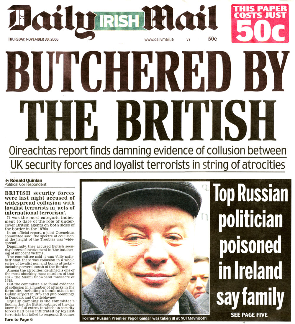 This story of collusion is one that is hard to find on the Irish Independent web pages – because it is either obscured (on the letters page) or simply not on the web page in the first place. Is this deliberate policy or merely indifference to the story of the British state terrorism in Ireland – or both?