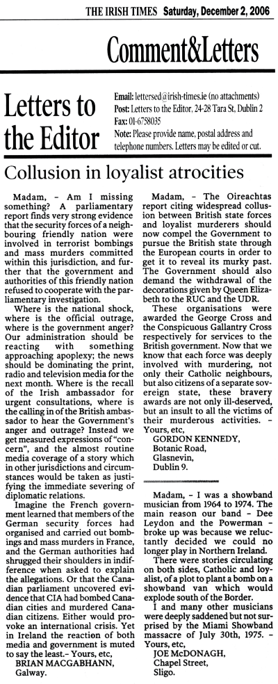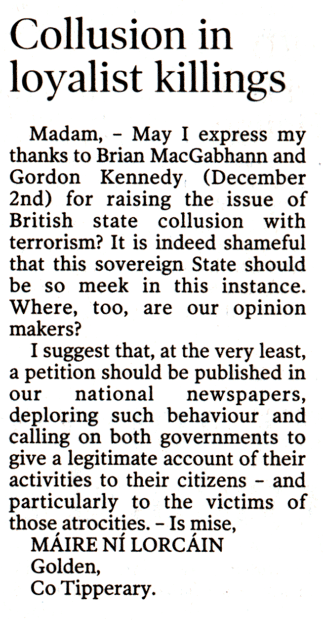 Madam, - May I express my thanks to Brian MacGabhann and Gordon Kennedy (December 2nd) for raising the issue of British state collusion with terrorism? It is indeed shameful that this sovereign State should be so meek in this instance. Where, too, are our opinion makers?