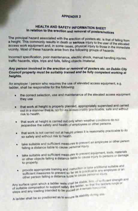 Thanks Dermot, What I was refering to essentially was the fact that there is a ban in place on O'Connell Street on notices of public meetings and assembly, and yet commercial banners/notices are attached to every pole on the street. I consider such a ban on notices of public meetings an abomination and an excrescence on the body politic that allows such a state of affairs. Apart from that, can you or anyone, enlighten me as to how the extant position is reconcoilable with the notices attached to the public property on the main public thoroughfare in the capital. ?