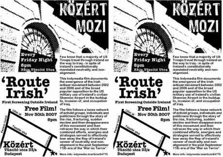 In the spirit of that ethos the editor, after this beta screening, will be making copies of the film without the voiceover commentary available to interested parties within the broad activist community which uses and contributes to the development of Revolt Video and Indymedia Ireland. It is hoped that those who disagree with the personal analysis/version of events put forward by 'Route Irish', or find it unsatisfactory, or want to improve it, will take it upon themselves to version* this slice of history.