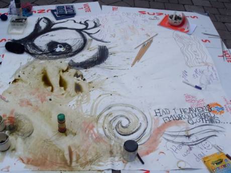 "Free Food, Free Stuff, Free Fun, Free Social Interaction, Free World for Everyone", was the chant of the day, encouraging everyone to join in the fun. 'Feck Money' could also be heard every now and again, amongst the joyful shouting and whooping! The event started at 1.30pm, when a 'Really Really Free Market', magically appeared out of nowhere; clothes, videos, toys, teddies, cards, matches, markers, crayons, zines and more were all decked out on a table and offered to bemused passers-by - for free. Confused by the idea of free stuff, those who were afraid to ask were left wondering 'what's the catch?' Needless to say, there was none. Just a group of people who believe in a better world where gifts can be given freely, and the only profit sought is the joy of making others happy. They were promptly joined by Galway Food-Not-Bombs, (who share vegetarian food and messages of peace and a better society, with the public), to feed the participants and onlookers with lovely vegetarian soup, bread and amazing cookies at the REAL recession busting price of no euros and no cents!