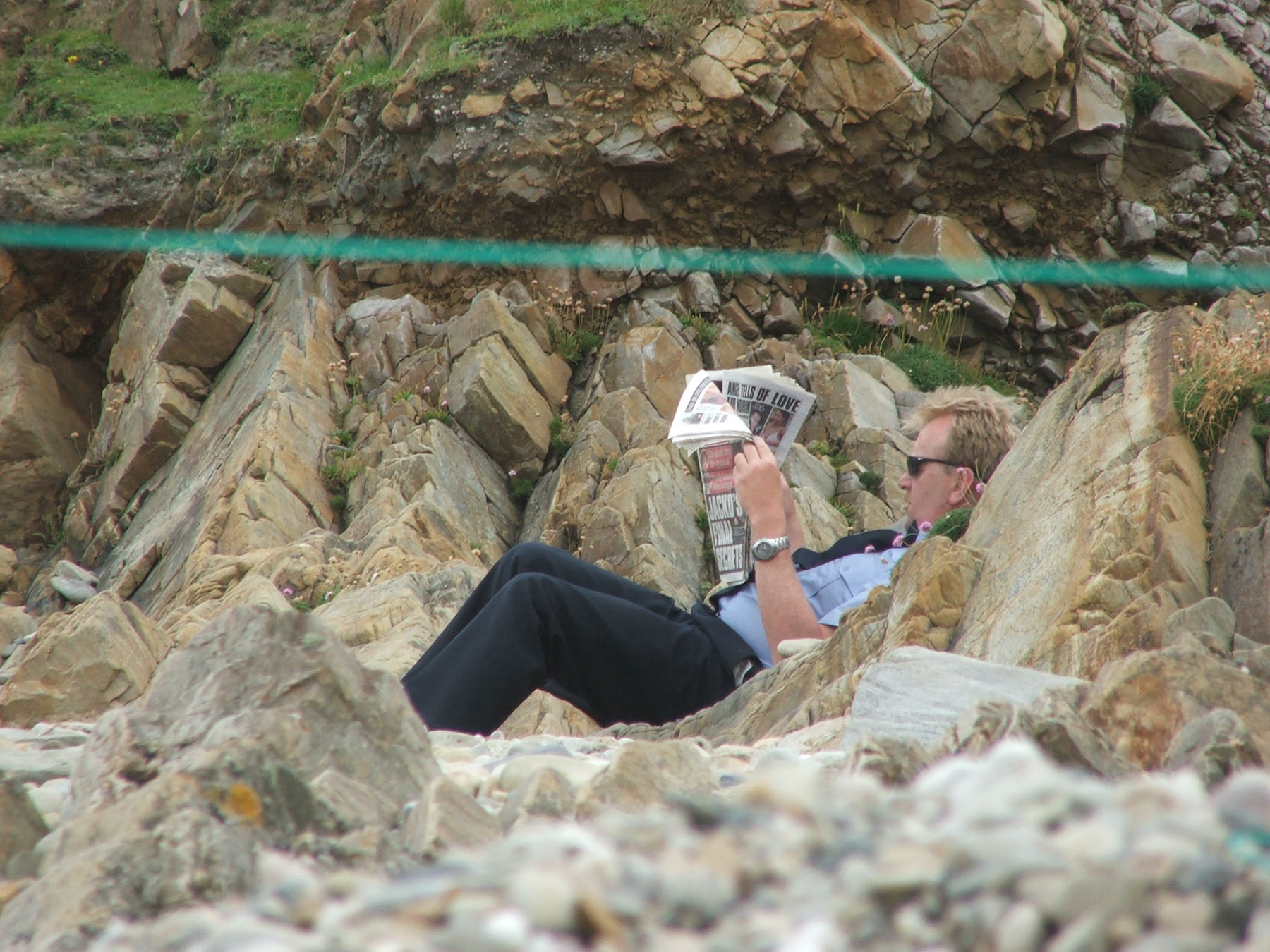 The high security operation that took place in Glengad at the weekend was well worth it. There were only a handful of protesters in the Solidarity camp, yet the Gardaí felt the need to have over fifty of their finest patrolling the beach. They are being paid treble time and also get a lodging allowance to stay in a local hotel whilst in the area. This picture, sums up what the Gardaí were doing that weekend. It's easy to see how protesters managed to stage two roadblocks on the same road one after another.