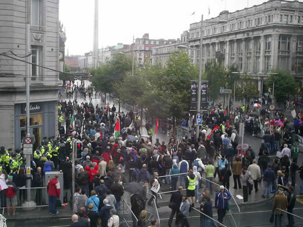 On Saturday 4th September Kate O’Sullivan, an activist from the Ireland Palestine Solidarity Campaign (IPSC), made a citizen’s arrest on former British Prime Minister Tony Blair at a book signing in Eason’s. However the Gardaí refused to act on the arrest, preferring instead to detain Ms. O’Sullivan for half an hour in a stairwell. At the protest outside Eason’s, where over 1,000 people gathered to protest the presence of Mr Blair in Ireland, at least three arrests of peaceful protesters where carried out, including that of a secondary school student. All have subsequently been released and are due in court on 30th September.