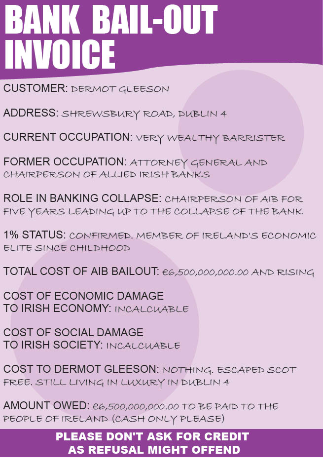 Here are the mock up Bank Bail Out Invoice and Revenue Commissioners Tax Demand that were left at Dermot Gleeson's and Demis O'Brien's mansions.