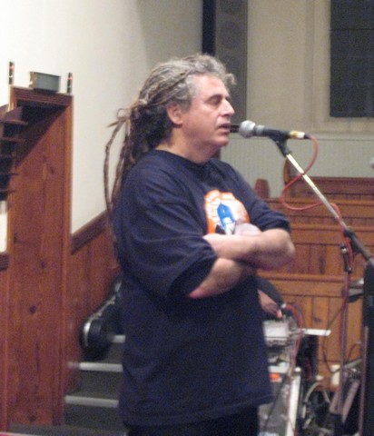Following John's great version of "Soldier Man", Jimmy Johns took the stage clearly moved by Widad's grief. Jimmy contrasted the mass devastation wrought on the Iraqi people with the minimalist response of the western peace movement. The anti-war movement had largely collapsed by the time he had returned from Iraq, long before the air war had run its course. He spoke of the need to move beyond containable protests of marching up and down in city streets. He shared recollections of camping in the Iraqi desert a few miles form the Saudi border, between these two massing armies. He spoke of the wild desert feral cats and the predictabe tensions and joys of planting 70 international activists in such an environment.